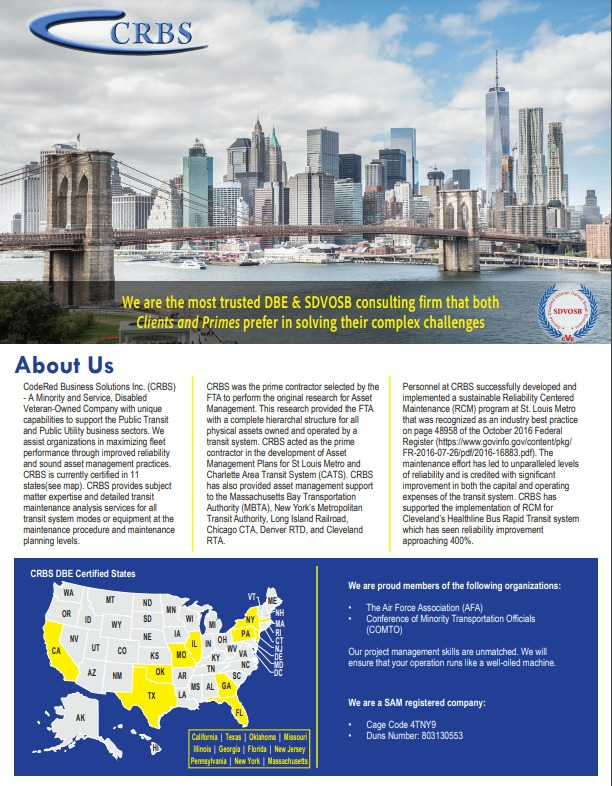 CodeRed Business Solutions Inc. (CRBS) works diligently and collaboratively with our customers to maximize efficiencies in operations and maintenance. We are ‘boots on the ground’ with many years of real-life experience managing operations and maintenance of transit systems. We are driven by analysis-based decision making to deliver excellence in service delivery to the public.